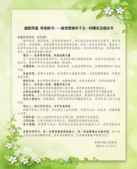 为培养员工感恩意识与社会责任感,提升公司资助育人工作成效,增强社会正面影响,借五一劳动节契机,公司组织受资助学子以公益行动回馈社会,用青春书写担当,让善意薪火相传!