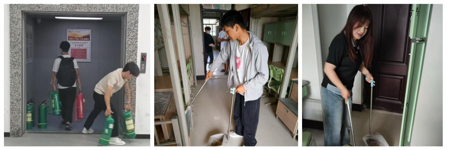 第二小组则深入1、3、5号新生宿舍楼,为即将入学的2025级新生营造洁净宜居的住宿环境。同学们清扫宿舍地面、擦拭桌面衣柜、并帮助检查宿舍内部设施是否完好。此次清扫充分展现了资环学子乐于奉献、勤劳踏实的精神风貌。